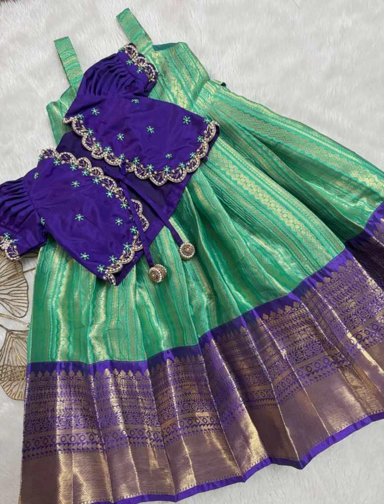 • “Draped in the richness of tradition. The vibrant emerald green of the skirt with its luminous gold zari weave meets a stunning royal purple blouse, exquisitely embroidered. Celebrating culture, color, and timeless craftsmanship. ✨💚💜