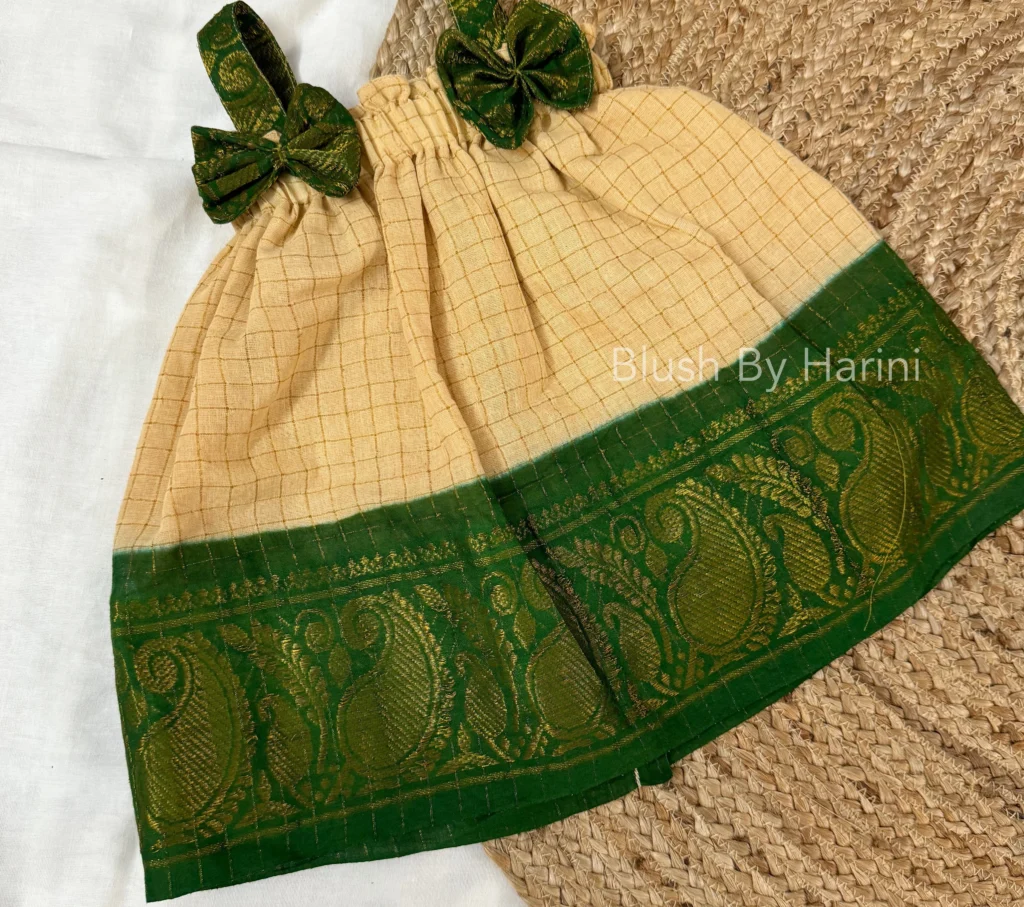 • This beautiful frock pairs a soft checked beige fabric with a rich emerald green border woven with intricate gold Zari paisley (manga) motifs. Finished with adorable matching bow details.