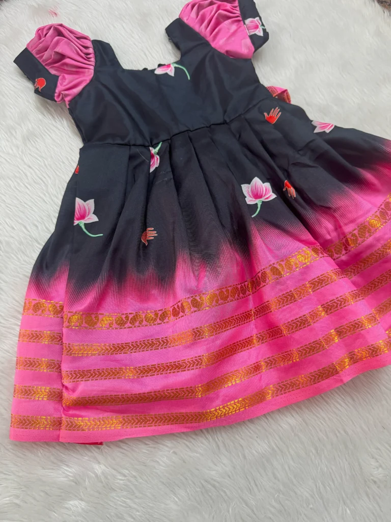 - This black frock features an eye-catching pink ombre effect that transitions to a rich, traditional zari border. We love the delicate pink lotus flower and hand prints and the sweet, ruched puff sleeves for a festive look.