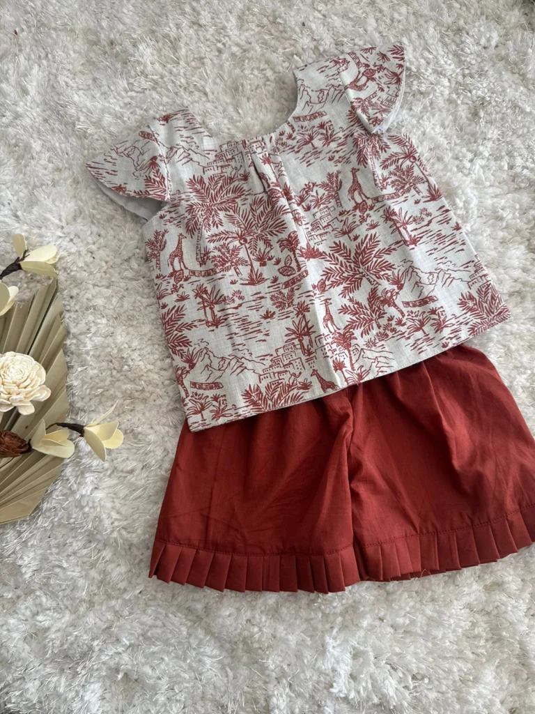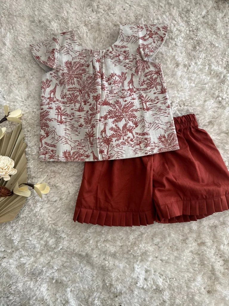- . Adorable safari‑print white top with red jungle motifs paired with rust‑red ruffled shorts – perfect for playful summer vibes! 🌞