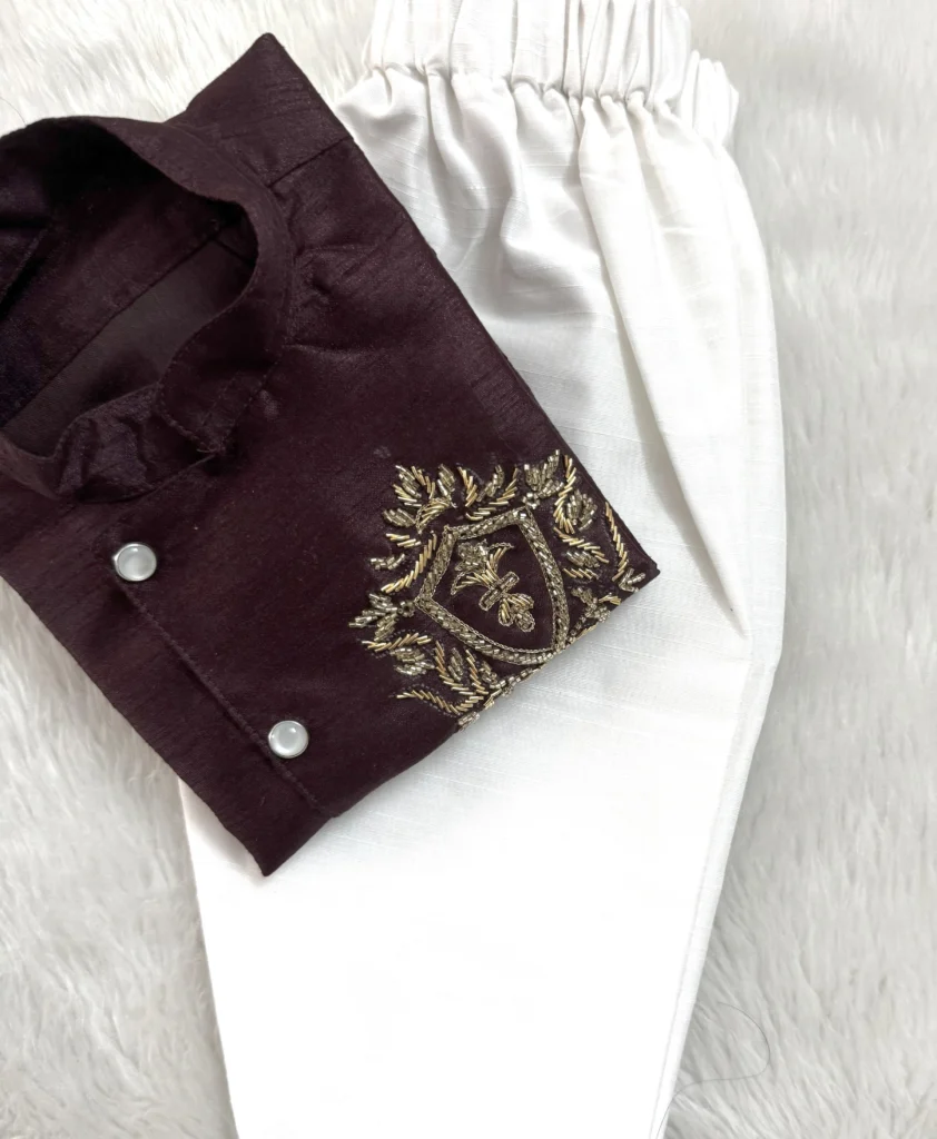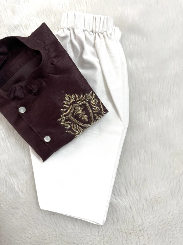 - A touch of timeless elegance for your little one. This deep plum/maroon Kurta features exquisite gold and bronze zari embroidery on the ches.t, perfectly paired with crisp white Pajama bottoms.