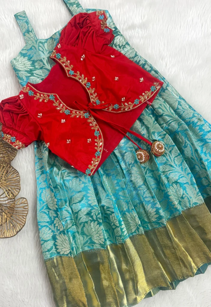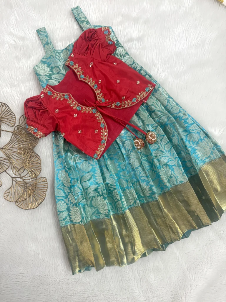 • A stunning turquois e and gold silk pavadai paired with a vibrant red embroidered jacket blouse – the perfect festive outfit for your little one! ✨.👗.
