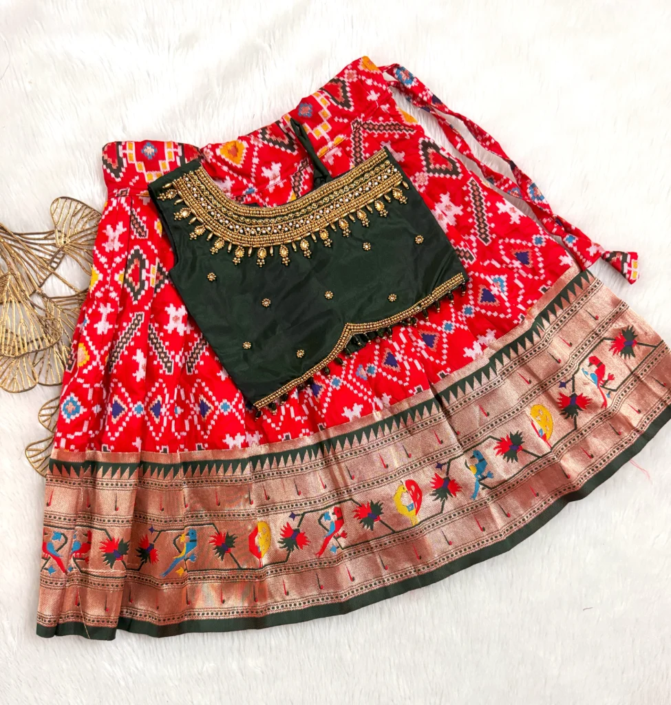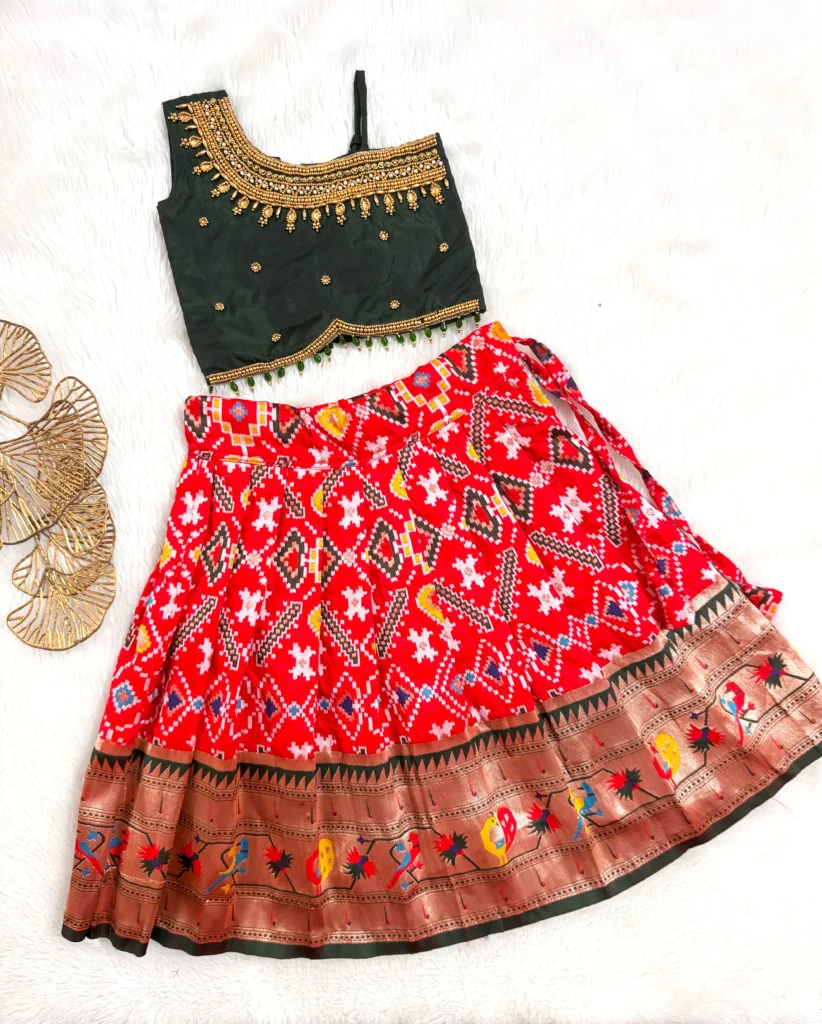 Bottle green heavy aari worked top paired with red Patola soft silk skirt❤️