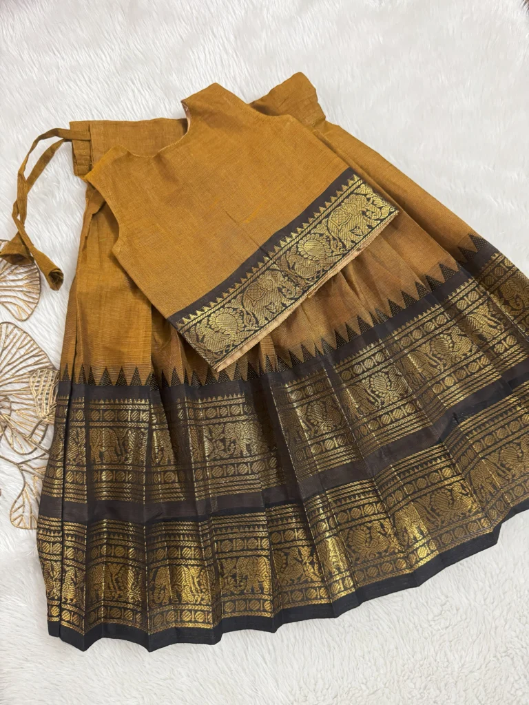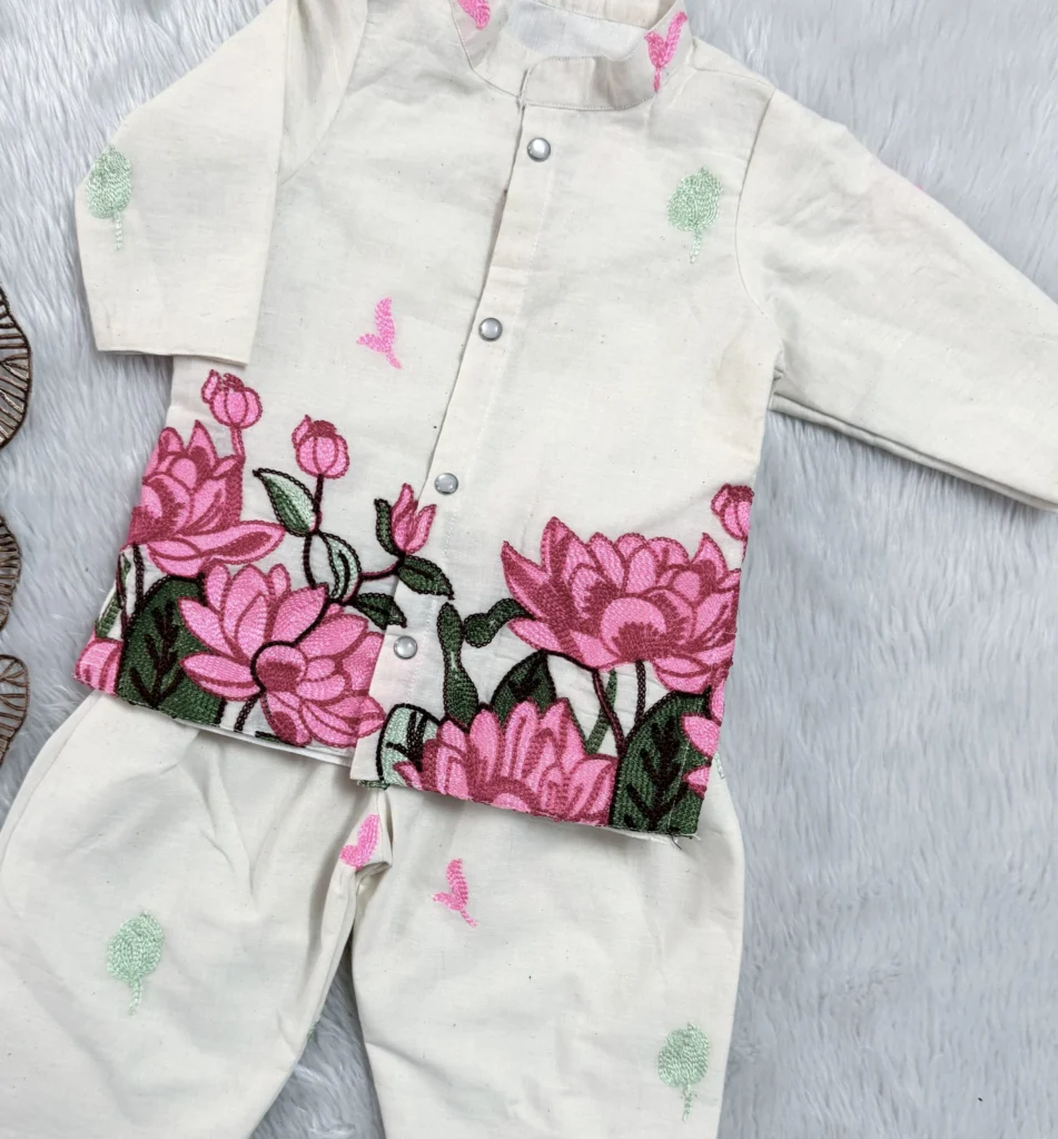 - A bright red halter blouse paired with a cream skirt adorned with colorful floral embroidery – a perfect blend of charm and festivity for little ones. 🌼🌺✨.