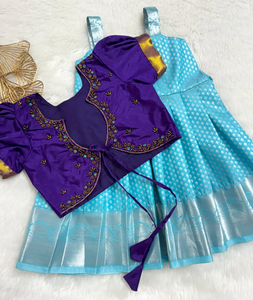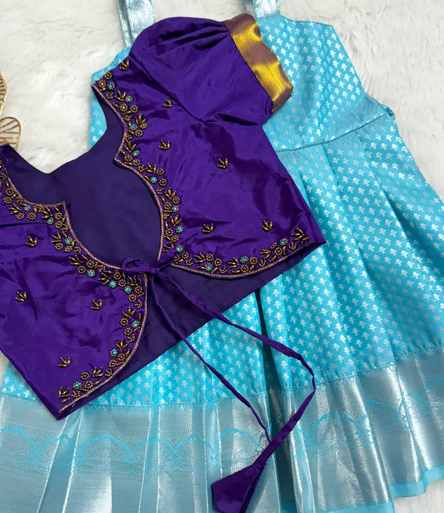 - A rich purple embroidered blouse with golden sleeve detailing paired with a sky-blue silk skirt, making a perfect blend of tradition and elegance for festive occasions.