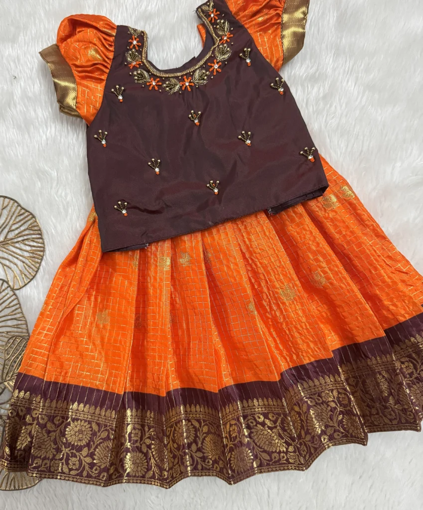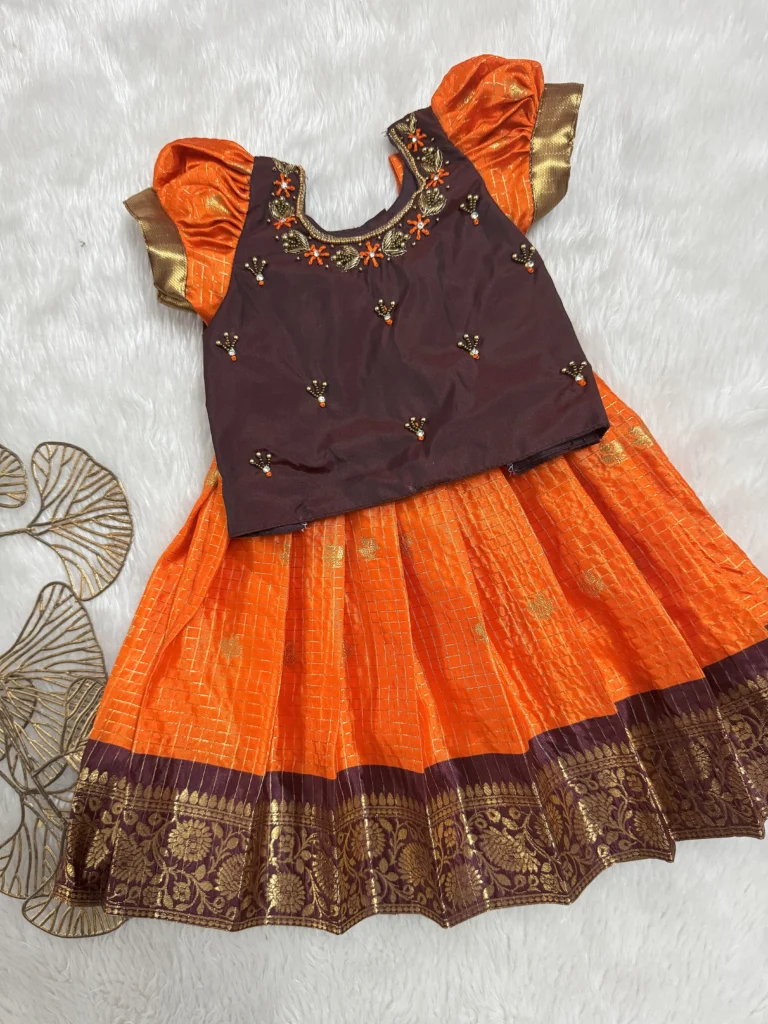 • Introducing our stunning Orange and Maroon Silk Skirt and Blouse Set. The rich, shimmering orange skirt features delicate gold detailing and a broad, intricately woven border, perfectly complementing the elegant maroon blouse with its beautiful hand-embroidered neckline. This traditional Pattu Pavadai is an ideal choice for temple visits, weddings, or any special occasion, bringing timeless charm to your little one’s wardrobe.