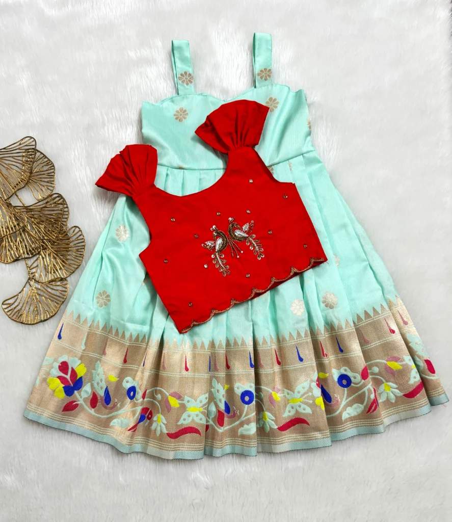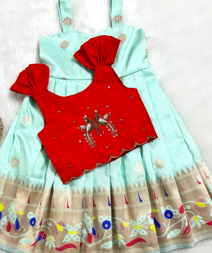 - “A delightful blend of pastel mint and vibrant red, highlighted with intricate peacock embroidery – a perfect festive look full of charm and tradition 🕊️❤️✨”.