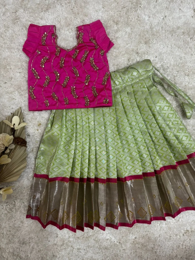 - Blouse with delicate gold leaf‑shaped zari & sequin embroidery top paired with a light green silk skirt featuring intricate white diamond jacquard weave, a broad gold zari border at the hem, and a contrasting pink piping that ties the Vibrant two pieces together – a festive, traditional Indian ensemble perfect for pink celebrations ✨