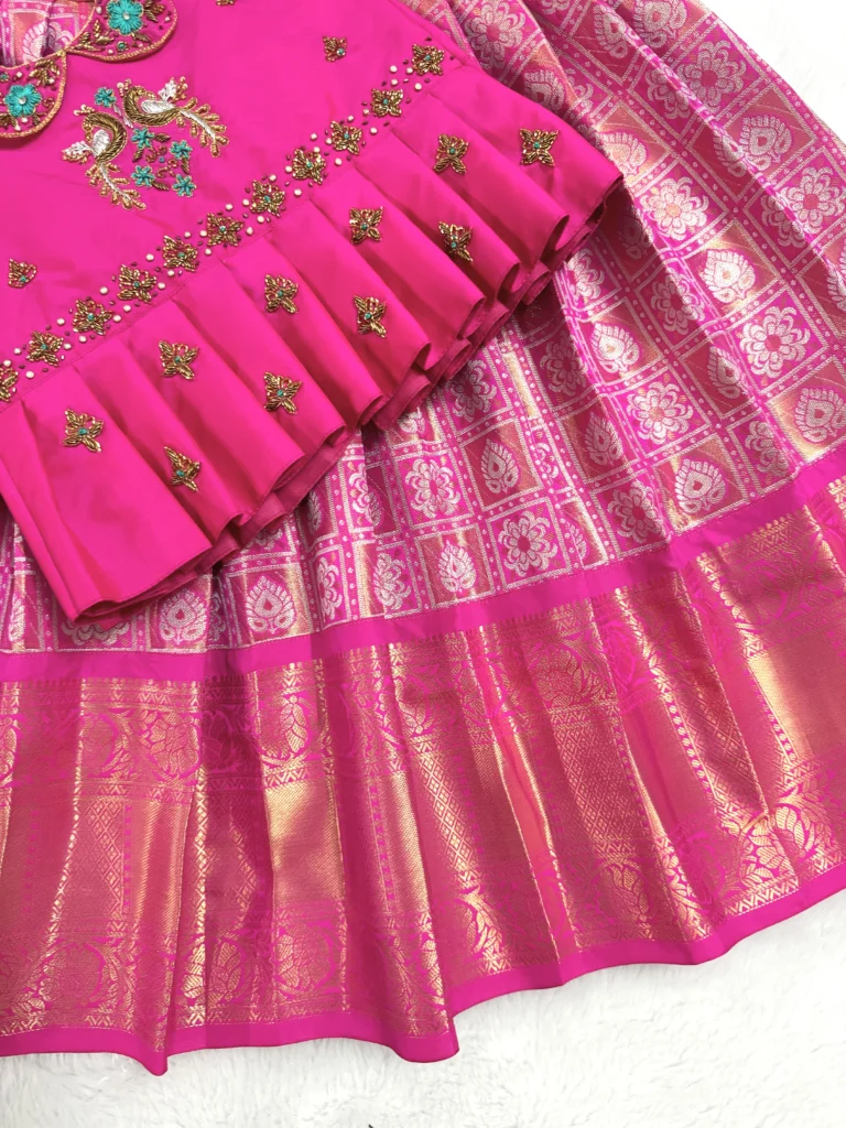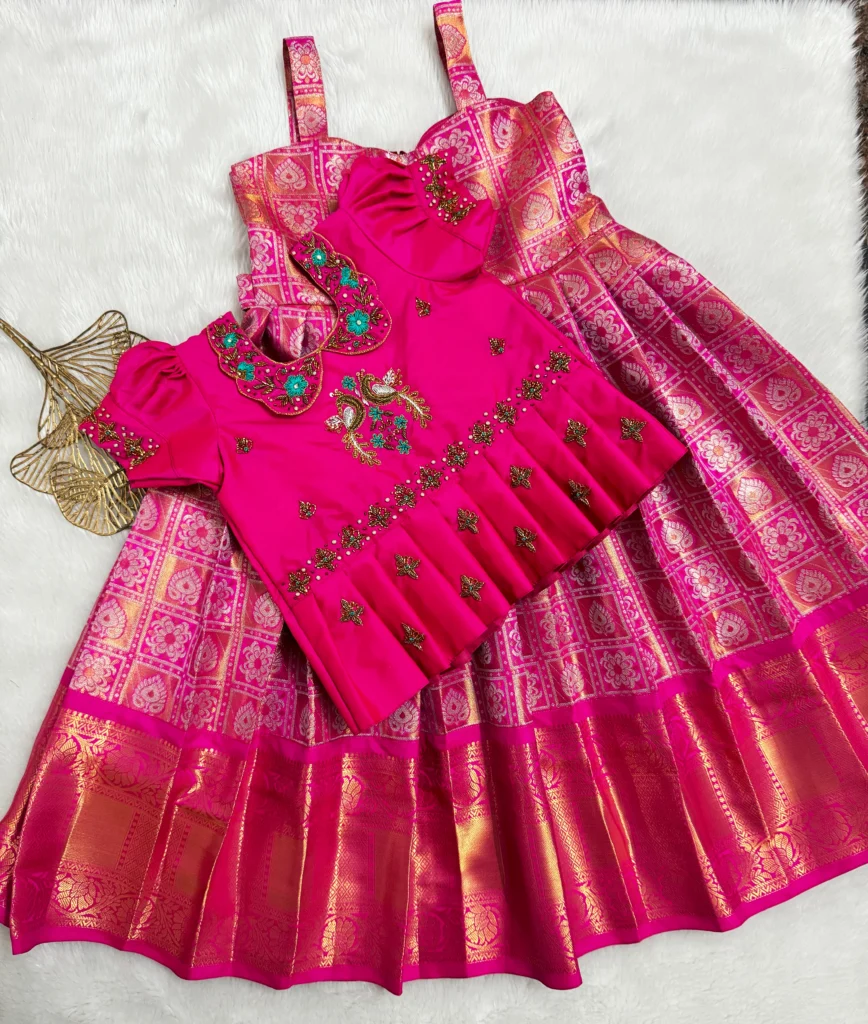 • A  premium kanchi silk frock paired with heavy aari worked top.