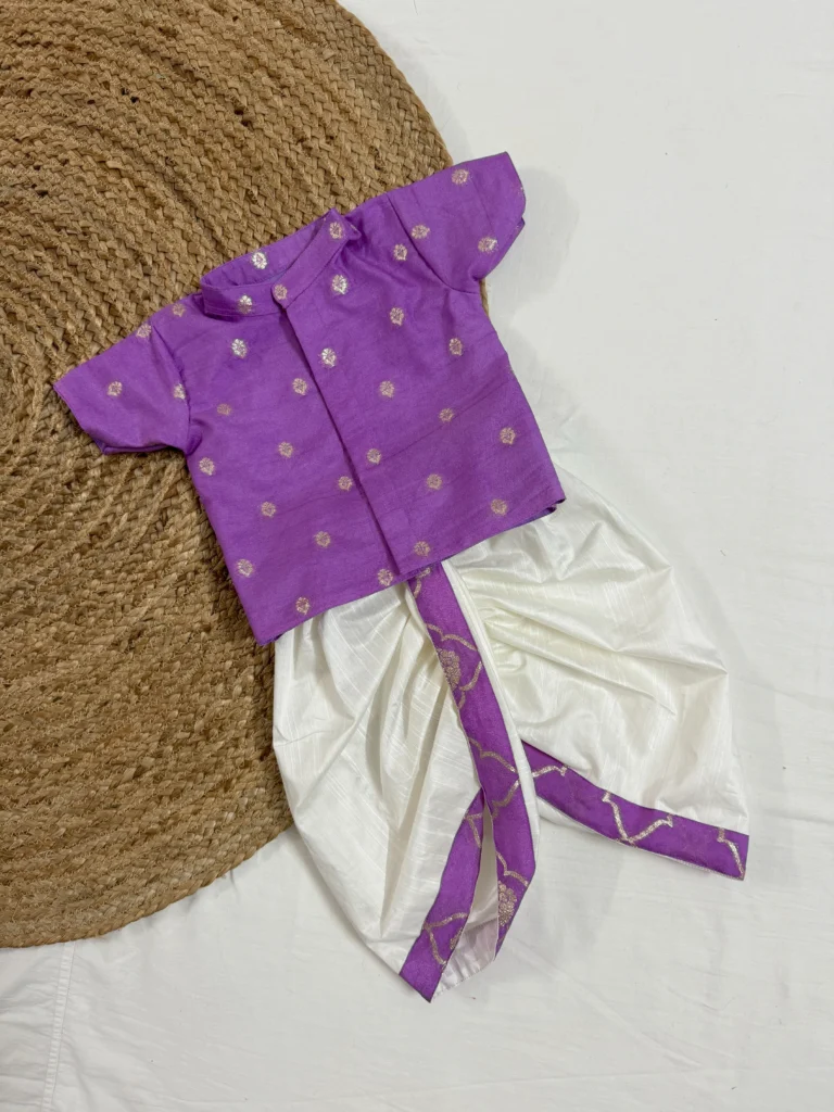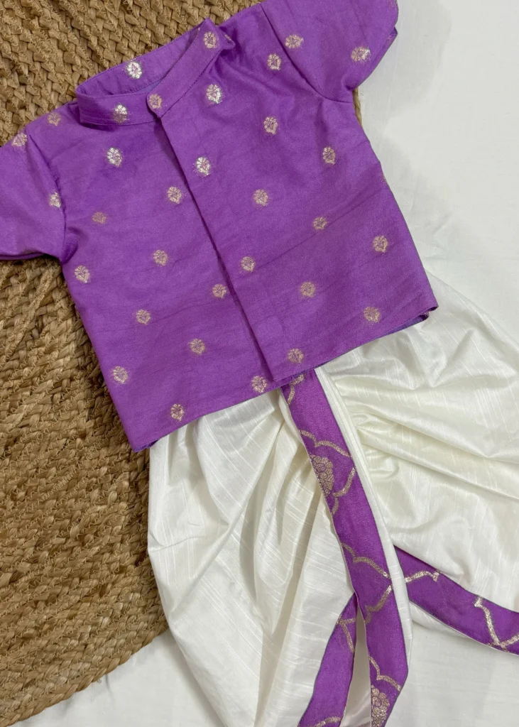 - Charming kids traditional outfit featuring a purple zari-embellished shirt paired with a white silk dhoti bordered in purple and gold, perfect for festive celebrations.