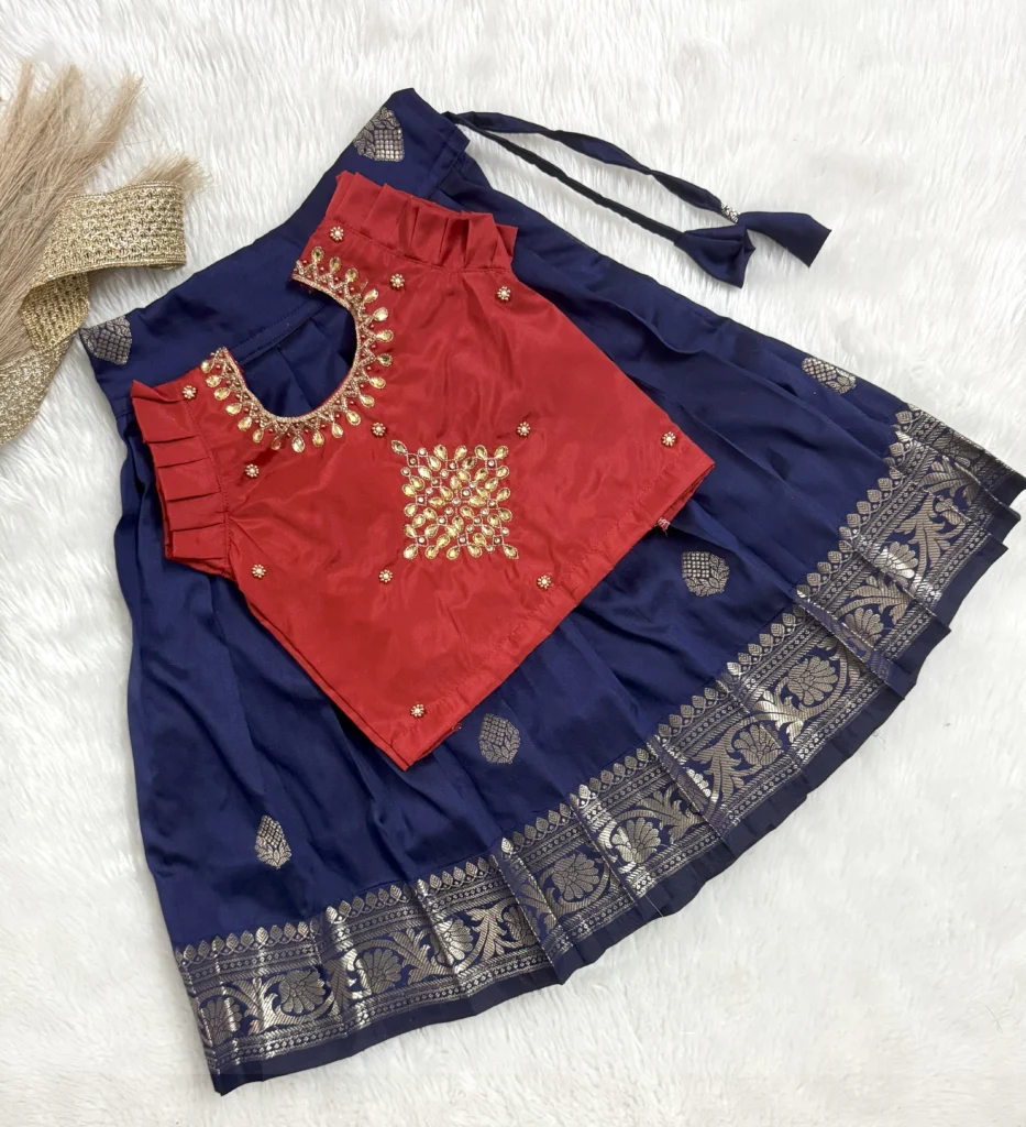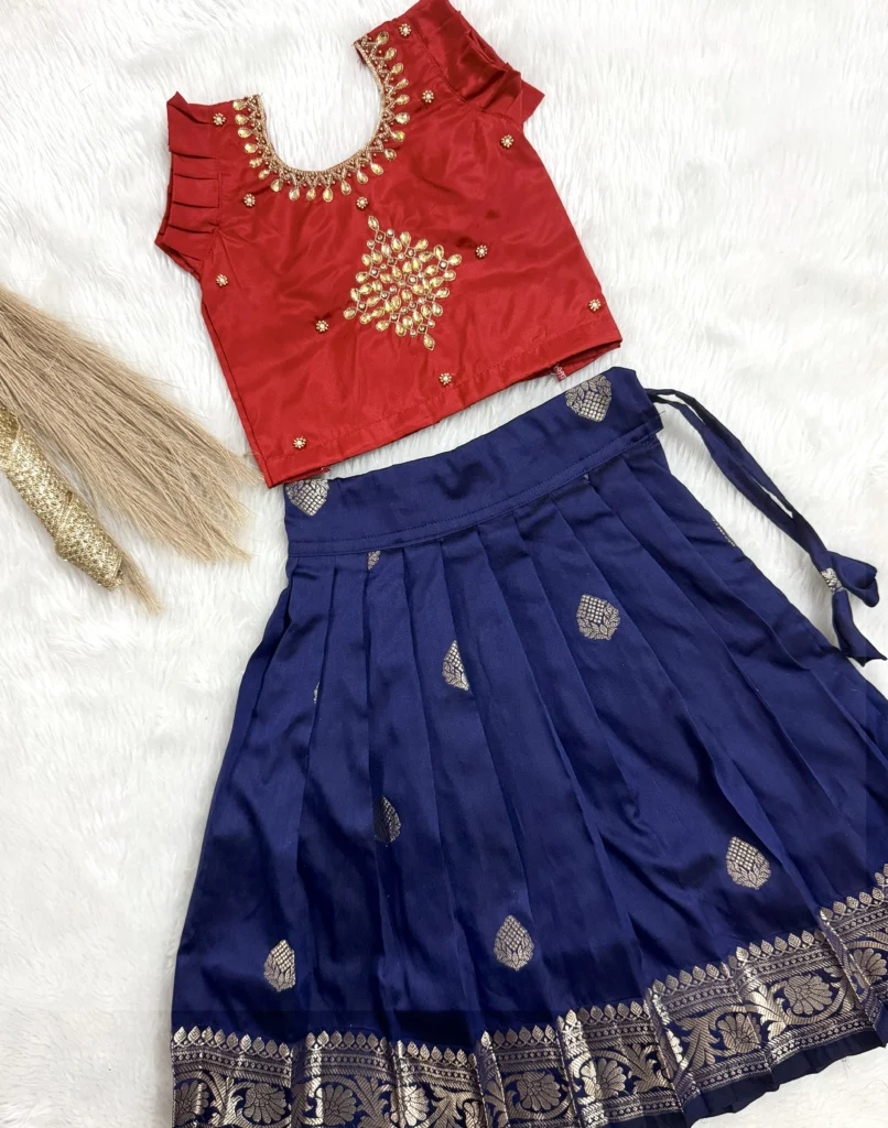 Soft silk dark blue skirt paired with red rangoli embroidered top ❤️.