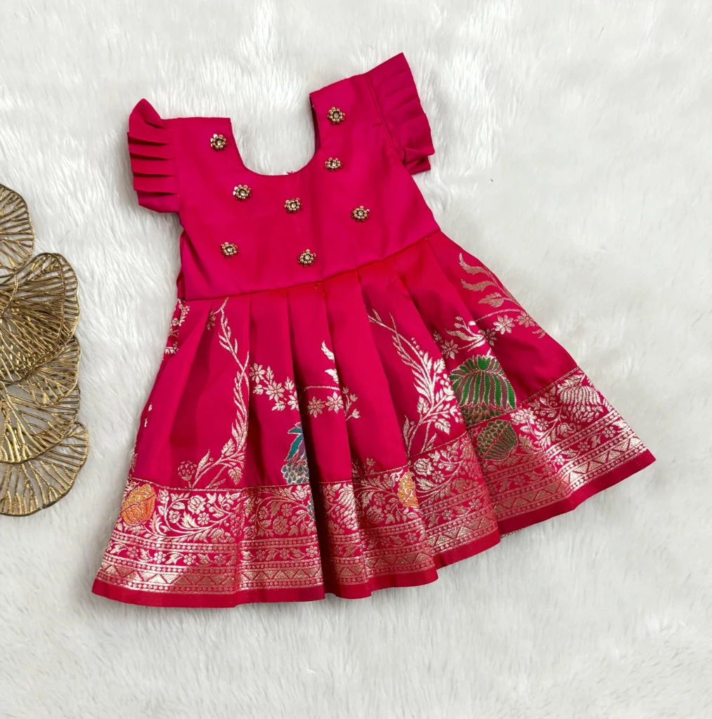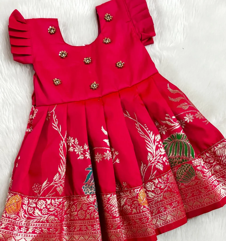vibrant red silk frock, adorned with golden zari motifs and delicate floral embellishments. A stunning choice for weddings, festivals, and special occasions! 🌺👧✨.