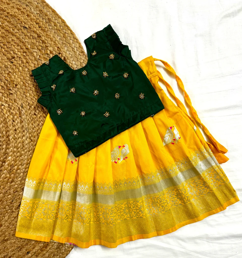 Add a burst of festive vibrance to your little one’s wardrobe with this elegant yellow Kanchi silk frock, adorned with traditional elephant motifs and rich zari borders. Paired with a deep green blouse embellished with intricate floral embroidery, this outfit is perfect for weddings and cultural celebrations! 🌼🐘✨.
