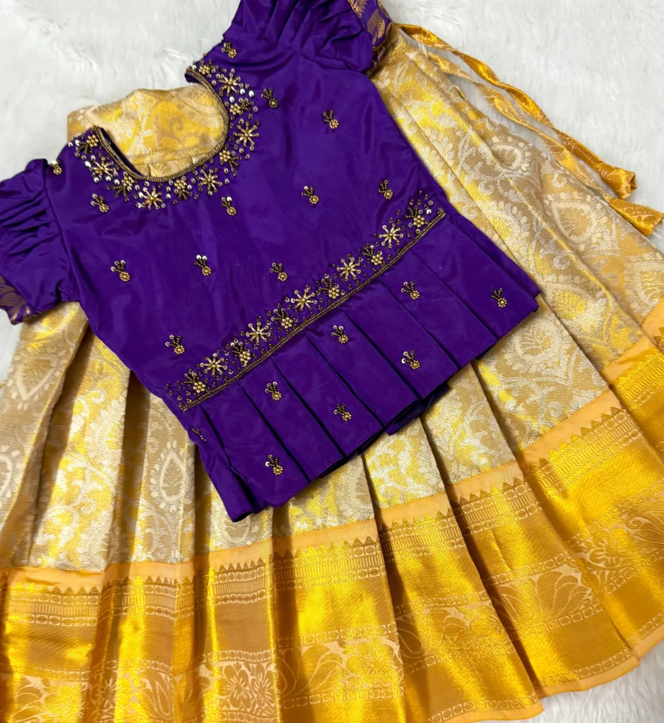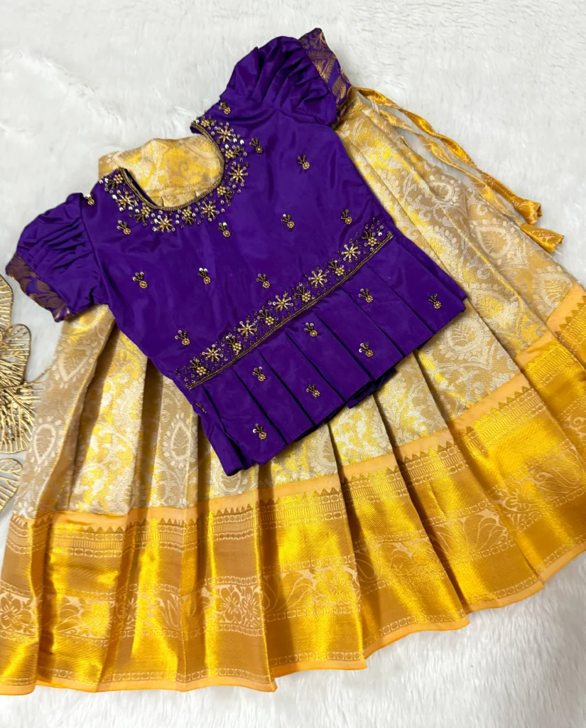 “Elegant traditional pattu pavadai with a rich purple blouse and golden silk skirt – a perfect blend of grace and heritage ✨💜💛”.