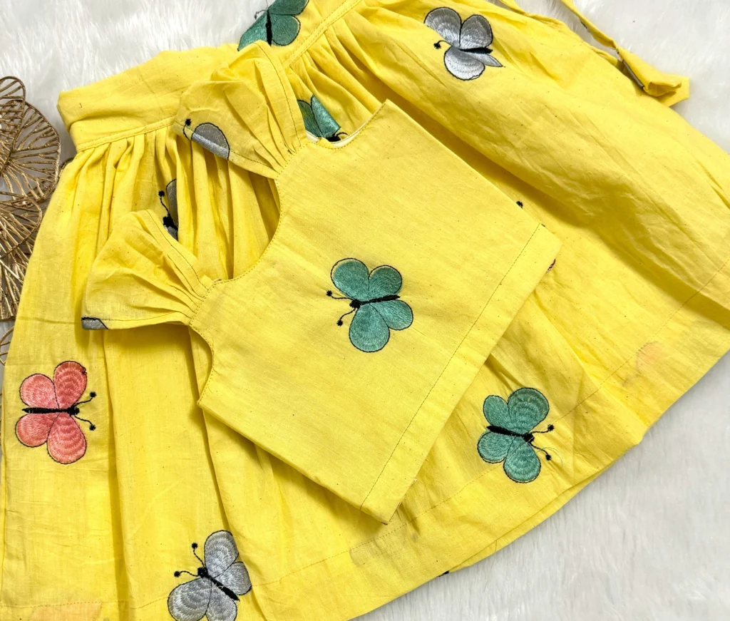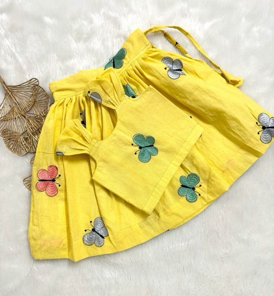 A cheerful yellow blouse and skirt adorned with colorful butterfly embroidery, bringing a playful and vibrant charm — perfect for little ones on festive and casual occasions.