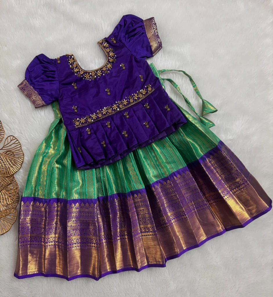 Semi kanchi sea green silk skirt paired with violet aari worked top.