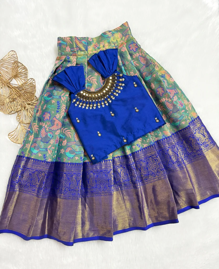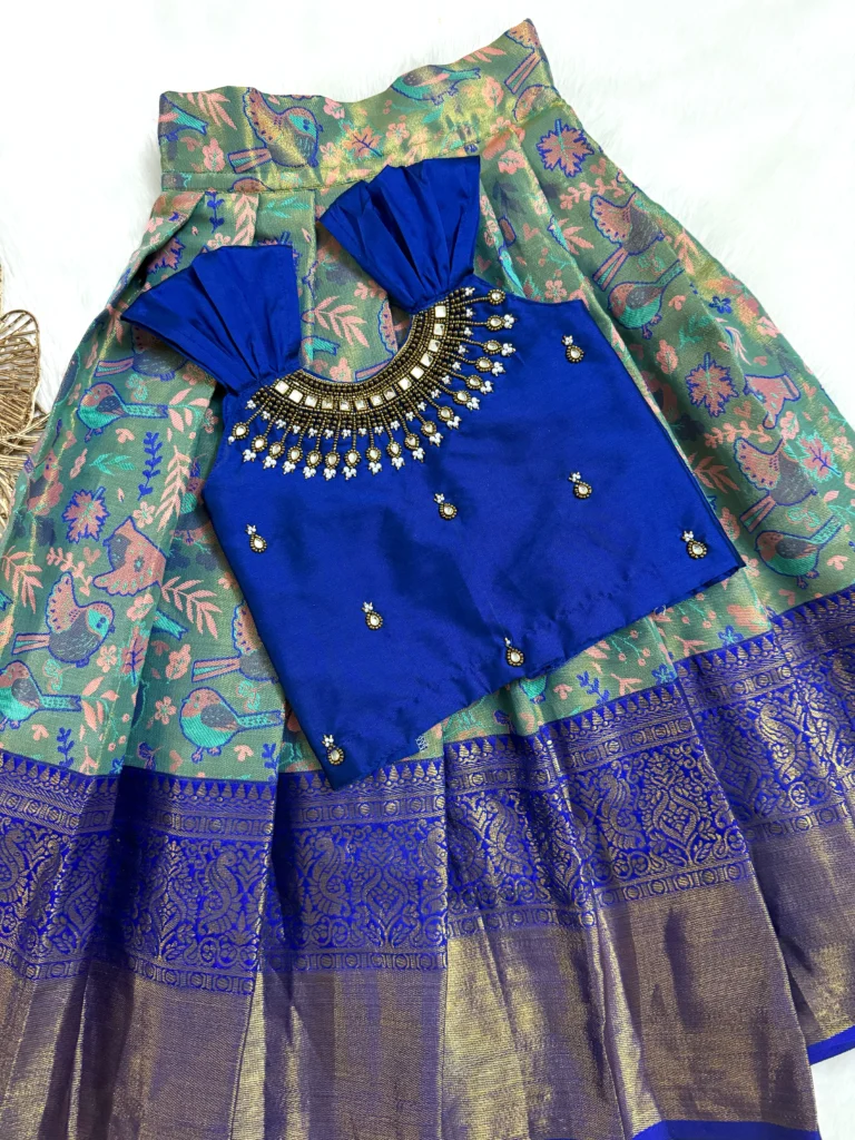 • The rich royal blue blouse with intricate beadwork perfectly complements the traditional green and gold skirt.