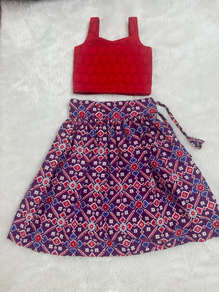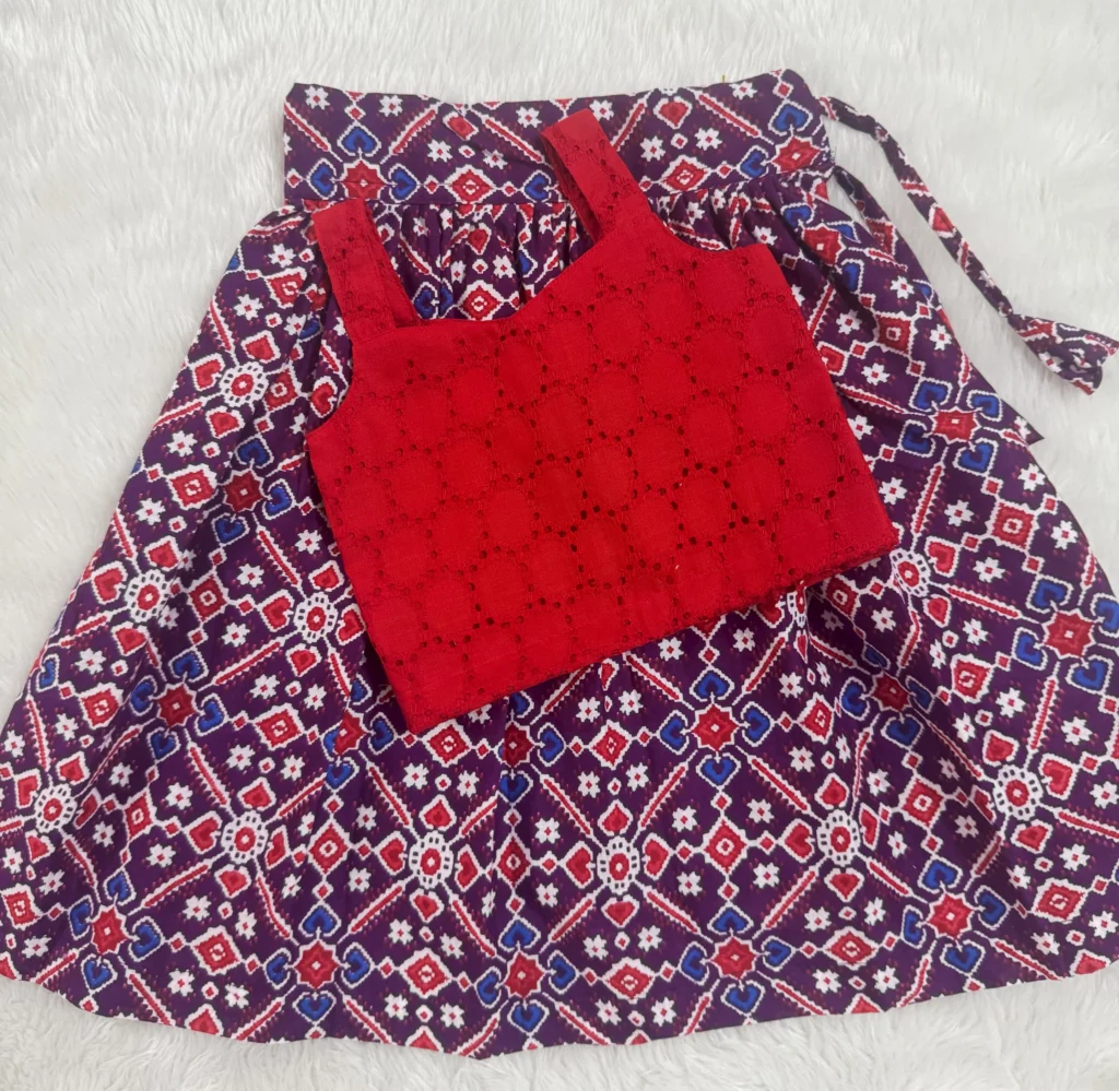 - Bringing a pop of color to your little one’s wardrobe with this gorgeous set! Featuring a vibrant purple skirt with an intricate traditional print and a bright red eyelet crop top. Perfect for Diwali, Navratri, or any special occasion.